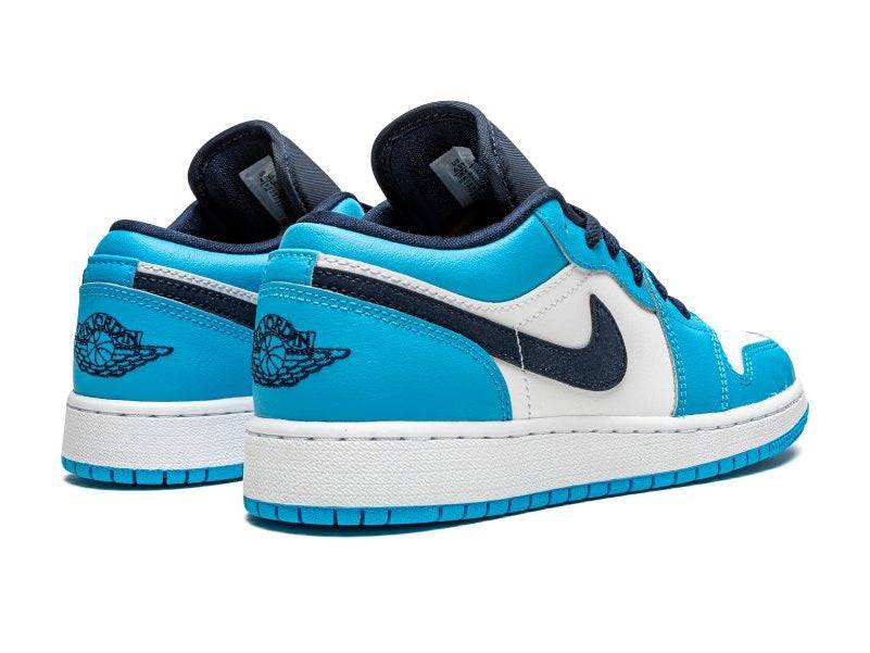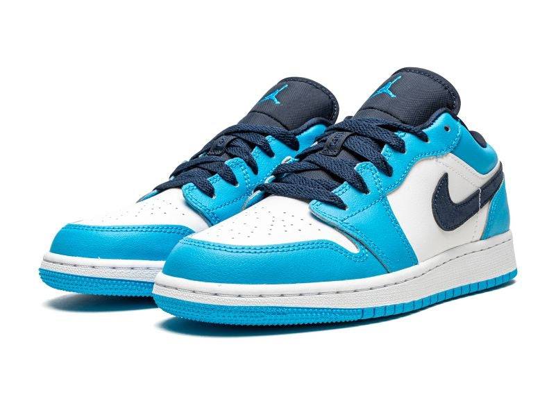 La Air Jordan 1 Low GS “UNC” est une édition jeunesse de la première chaussure signature de Michael Jordan qui s'inspire d'une source populaire de la ligne Air Jordan : les UNC Tar Heels. Basée sur le style original “UNC” de la Jordan 1, cette version moderne de la palette de couleurs inspirée du basketball universitaire associe Obsidian et des accents Powder Blue. L'orteil perforé et le panneau central sont contrastés par du cuir bleu clair sur l'avant-pied, les œillets, le col et le talon. Un Swoosh en cuir Obsidian se trouve de chaque côté et un logo “Wings” en Obsidian est brodé à l'arrière de la chaussure. Jordan Brand place un Jumpman Powder Blue sur la languette en nylon bleu foncé. Des détails ton sur ton “23” apparaissent sur le recouvrement des lacets intégré dans le design de la languette. Pour compléter le look, Jordan Brand fournit la Jordan 1 Low “UNC” pour enfants avec une semelle intermédiaire en caoutchouc blanche et une semelle extérieure bleu clair.