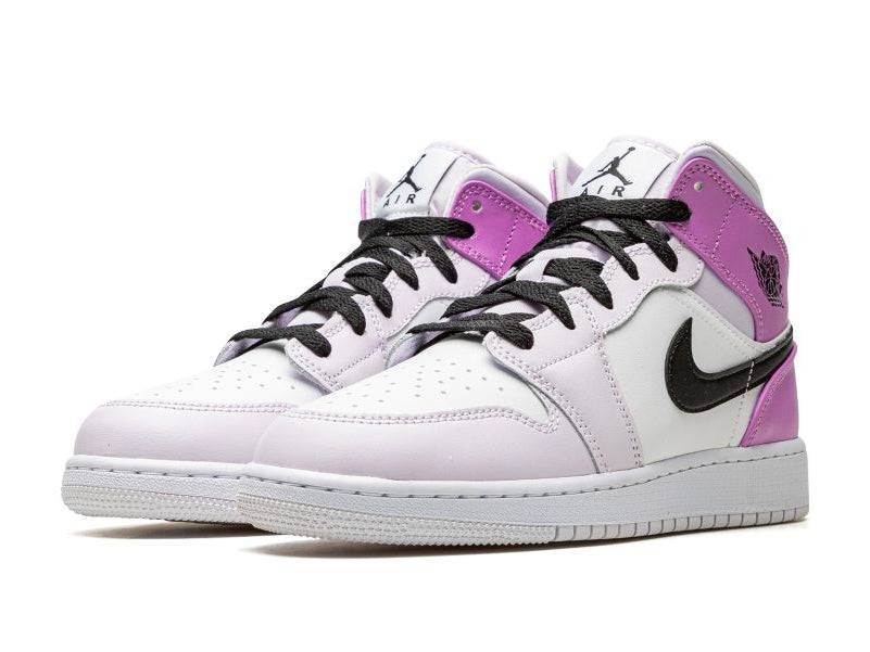 La Air Jordan 1 Mid GS "Barely Grape" est la taille jeunesse de la chaussure lifestyle dans une combinaison de couleurs agréable à l'œil. Surnommée "Barely Grape", cette Jordan 1 Mid GS présente un schéma de couleurs attrayant de blanc, noir et violet dans son design. Plus précisément, la base de la chaussure est conçue en cuir blanc tandis qu'un Swoosh en cuir noir se trouve sur les côtés. La capuchon des orteils, l'avant-pied et les œillets apparaissent en cuir de couleur lavande clair tandis que le col et le talon sont en cuir Barely Grape. Un logo "Wings" noir réside sur le revêtement du col et des logos Jumpman et "Air" noirs apparaissent sur l'étiquette de la languette. La semelle intermédiaire en caoutchouc blanc et la semelle extérieure crème clair complètent le look.