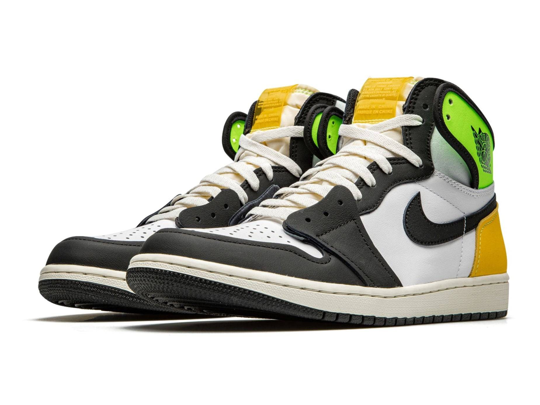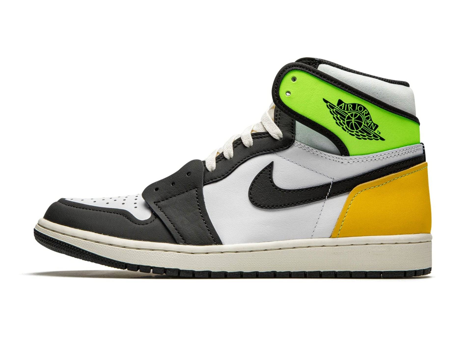 La Air Jordan 1 High "Volt University Gold" est une couleur inspirée du "faites-le vous-même" de la première chaussure signature de Michael Jordan, qui a été lancée par Jordan Brand au début de 2021. Conçue dans l'esprit des Air Jordan 1 déconstruites d'Off-White et Virgil Abloh de la collection convoitée "The 10", la "Volt Gold" présente des teintes contrastées de jaune néon et d'or dans son design, ainsi que des panneaux en cuir "surtaillés" qui dépassent de la couture. Du cuir blanc se trouve sur l'orteil perforé et le panneau central. Du cuir noir contrastant apparaît sur l'avant-pied, le capuchon de l'orteil et les œillets. Un logo "Wings" noir se trouve sur le revêtement de col Volt et un Swoosh noir apparaît de chaque côté de la chaussure. D'autres détails incluent un panneau en cuir doré sur le talon, des lacets de chaussure crème et une semelle intermédiaire crème inspirée du vintage. Une étiquette de langue translucide teintée d'orange inversée "Nike Air" apparaît sur la langue en nylon crème.
