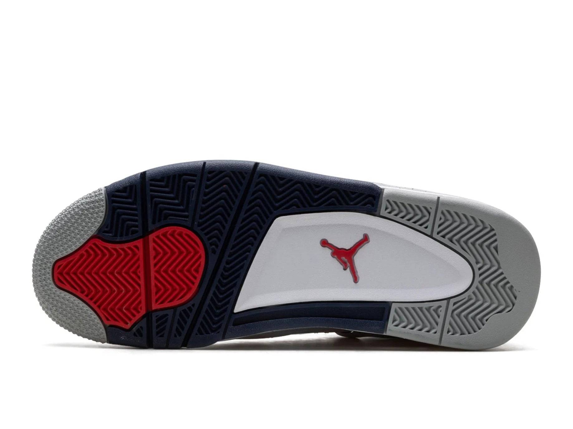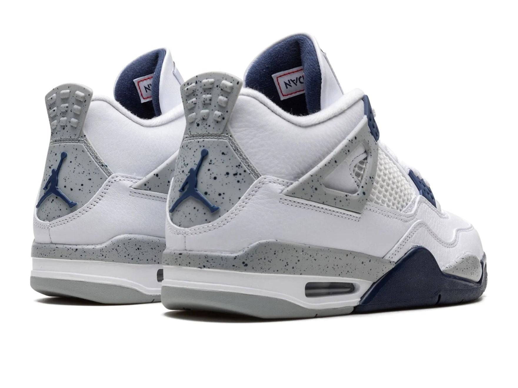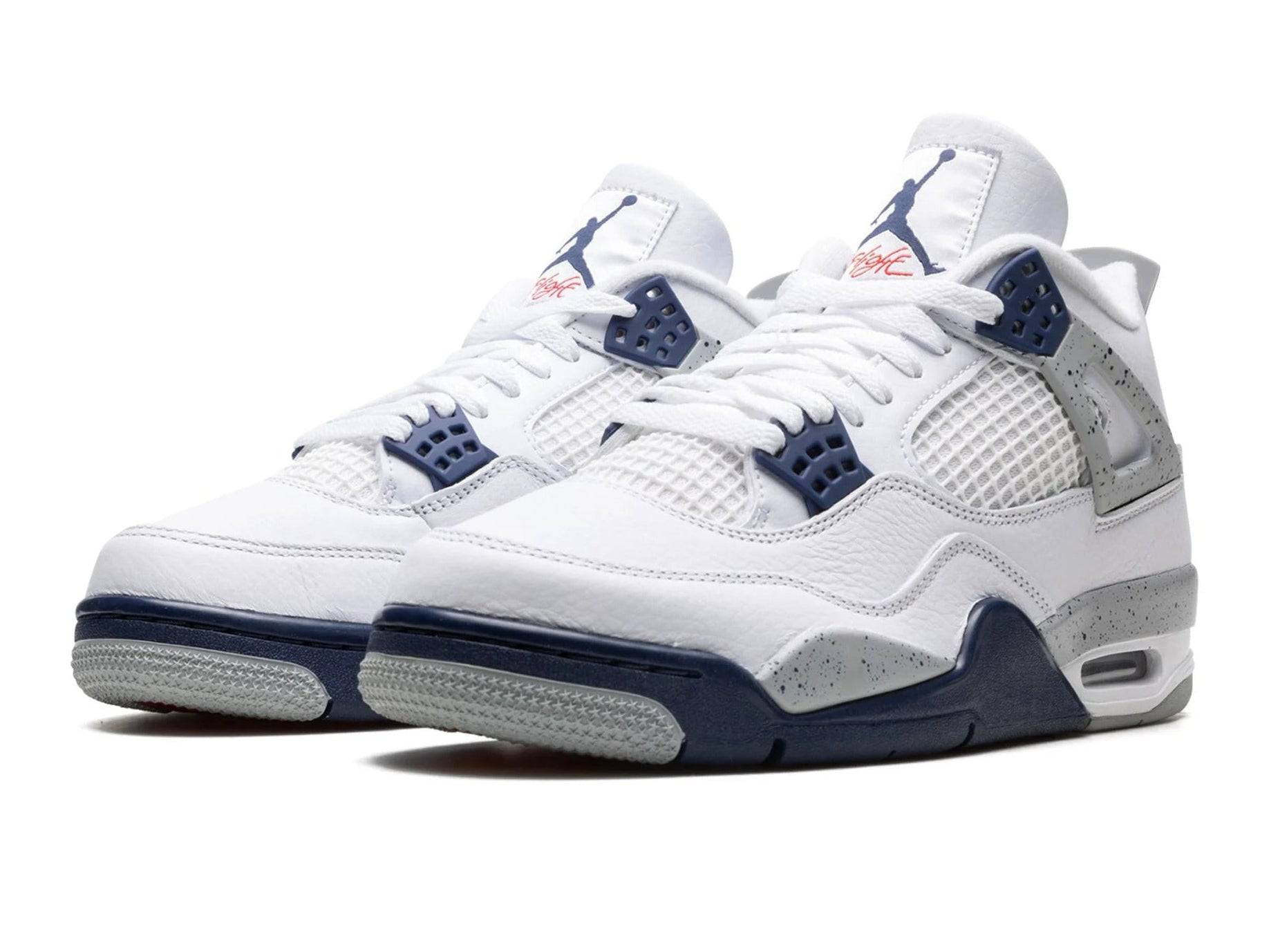 La Air Jordan 4 "Midnight Navy" est une couleur de la quatrième chaussure signature de Michael Jordan, inspirée par le style emblématique "White Cement" du modèle. La "Midnight Navy" reproduit le schéma de couleurs de la Jordan 4 "White Cement", mais remplace les accents rouges de la chaussure par du marine. La tige est construite en cuir blanc, à l'exception de la languette et du panneau central qui présentent des détails en maille tonale. Des supports de lacets en plastique Midnight Navy se trouvent sur la gorge et le col. Les détails signature "Cement" de la Jordan 4 apparaissent sur les onglets "Wings", sur le garde-boue, et sur le contrefort de talon marqué Jumpman et "Air". Une unité Air visible dans le talon complète le design.