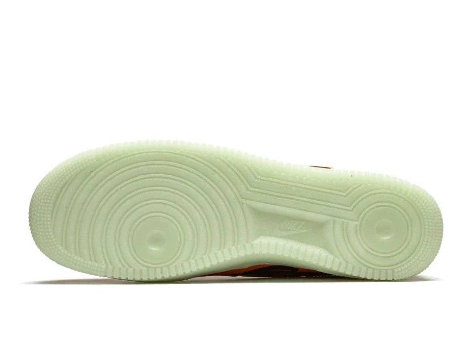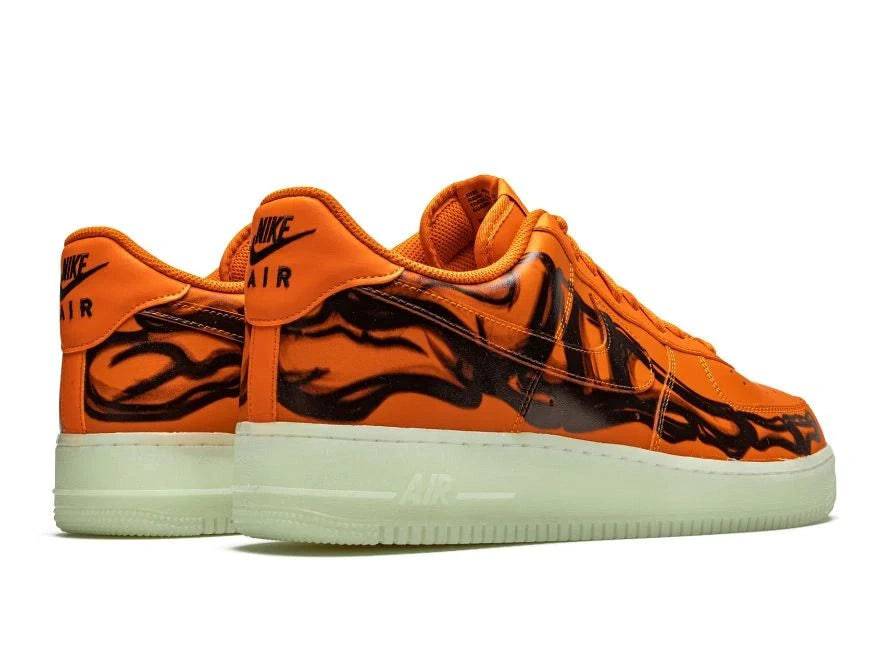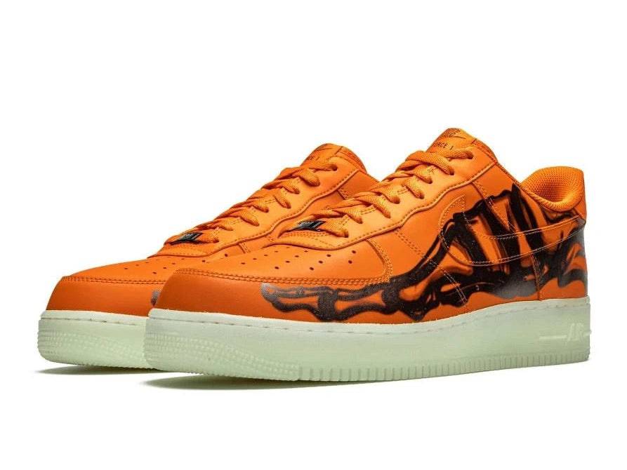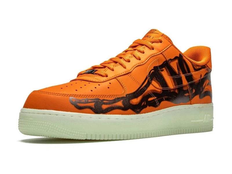 La Nike Air Force 1 Low « Orange Skeleton », sortie pour Halloween 2020, est un ajout effrayant et festif à la collection lifestyle emblématique de Nike. Cette sneaker en édition limitée suit les coloris « Blanc » et « Noir » sortis les années précédentes pour célébrer la fête. La tige présente un motif Halloween qui brille dans le noir, avec un graphique représentant les os d'un pied de chaque côté. La base est en cuir « Starfish » et est complétée par un Swoosh ton sur ton et une broderie « Nike Air » sur le talon. Les semelles intérieures présentent également le même graphique squelette. Contrairement aux versions précédentes, la version 2020 est dotée d'une semelle intermédiaire et d'une semelle extérieure qui brillent dans le noir, ce qui permet à l'ensemble de la chaussure d'illuminer dans le noir.