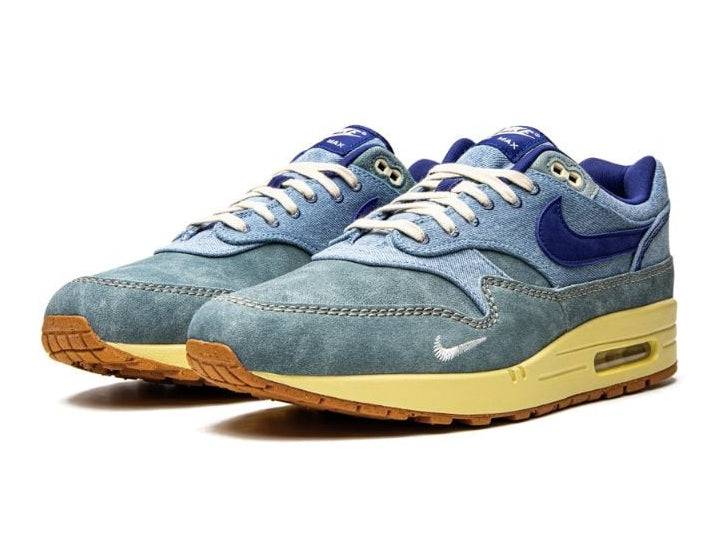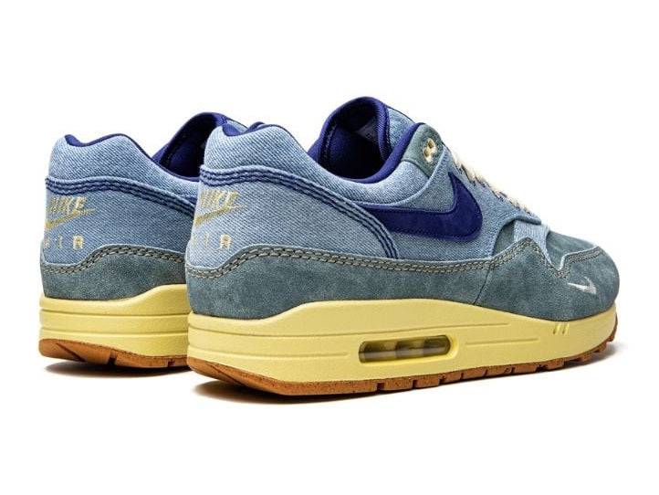 La Nike Air Max 1 « Dirty Denim » est un coloris unique de la chaussure de course rétro qui s'inspire de nul autre que des jeans bien portés pour son design. Sortie à l'été 2022, le « Dirty Denim » est une réédition moderne d'une sorte du même coloris que Nike a introduit en 2003. Ici, la tige présente une combinaison d'une base en denim indigo lavé avec des superpositions en daim bleu d'inspiration vintage. Le cuir Deep Royal Blue apparaît sur le Swoosh de chaque côté de la chaussure. La même teinte bleu foncé apparaît également sur l’étiquette de la languette avec la marque « Nike Air Max » et Swoosh » et la doublure intérieure. Une semelle intercalaire contrastée de couleur Lemon Wash renforce l'apparence rétro de la chaussure.