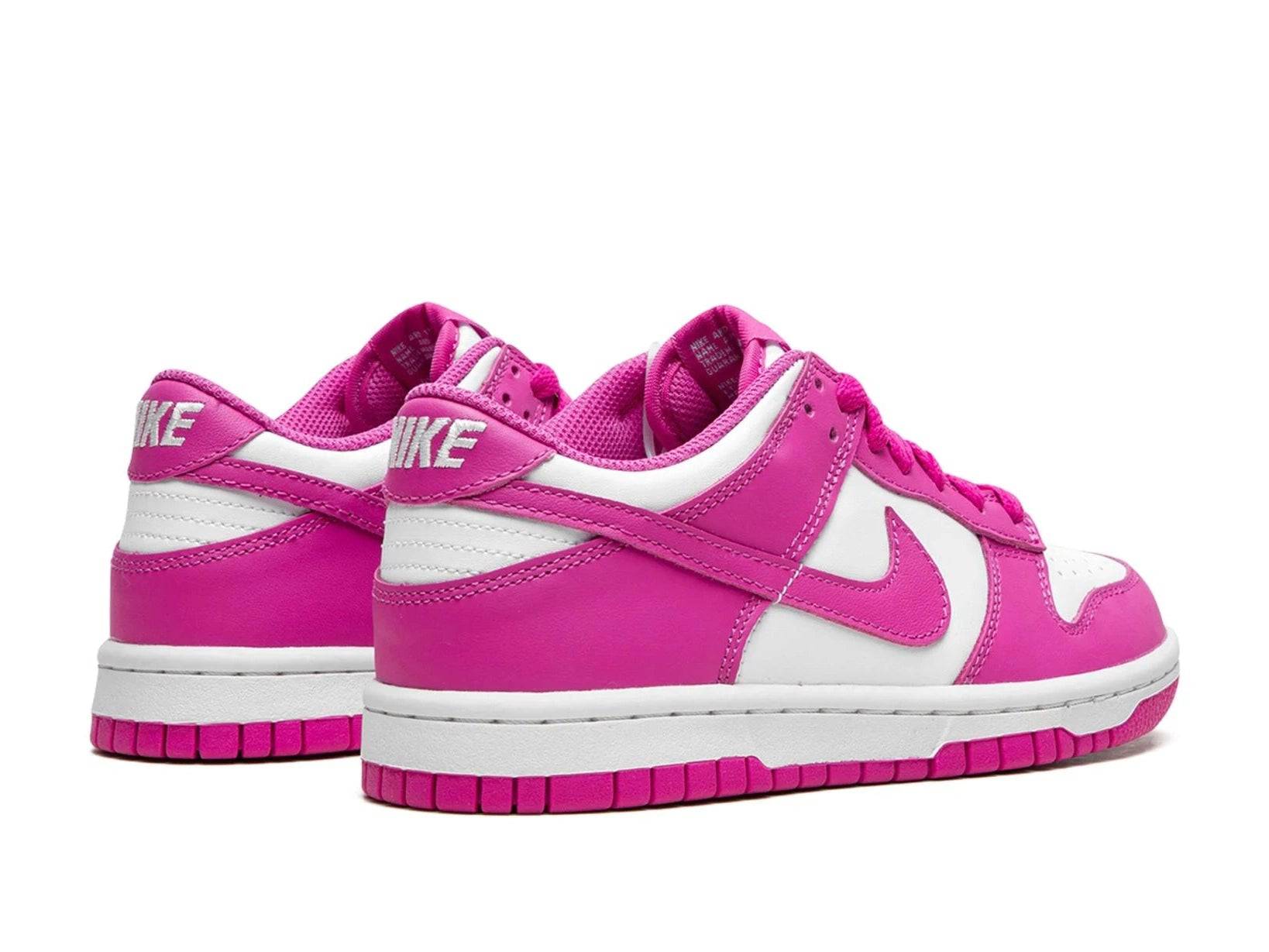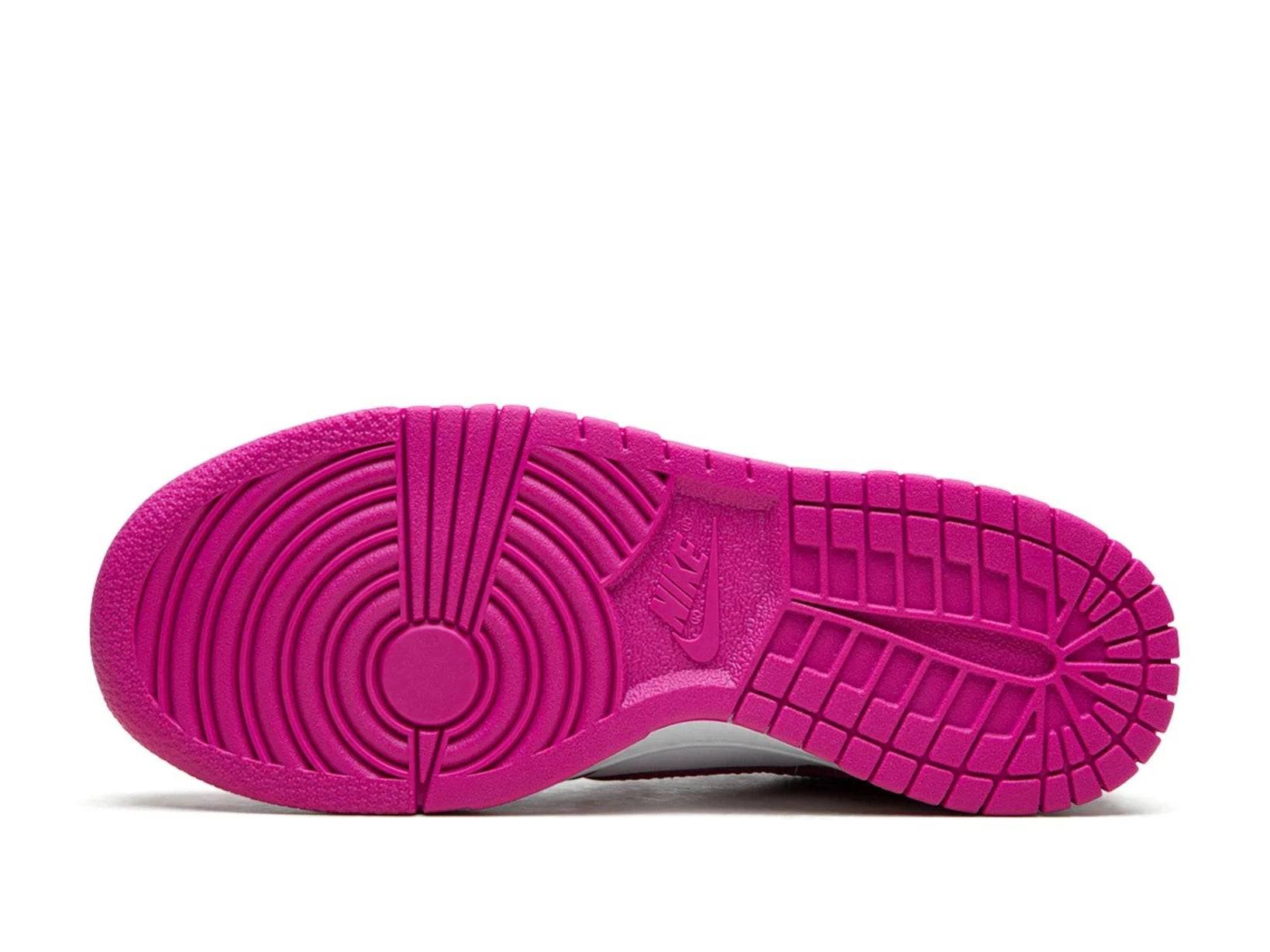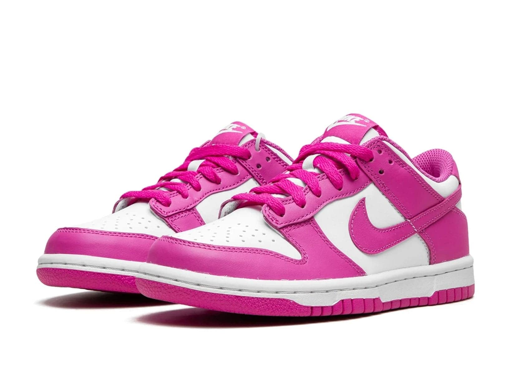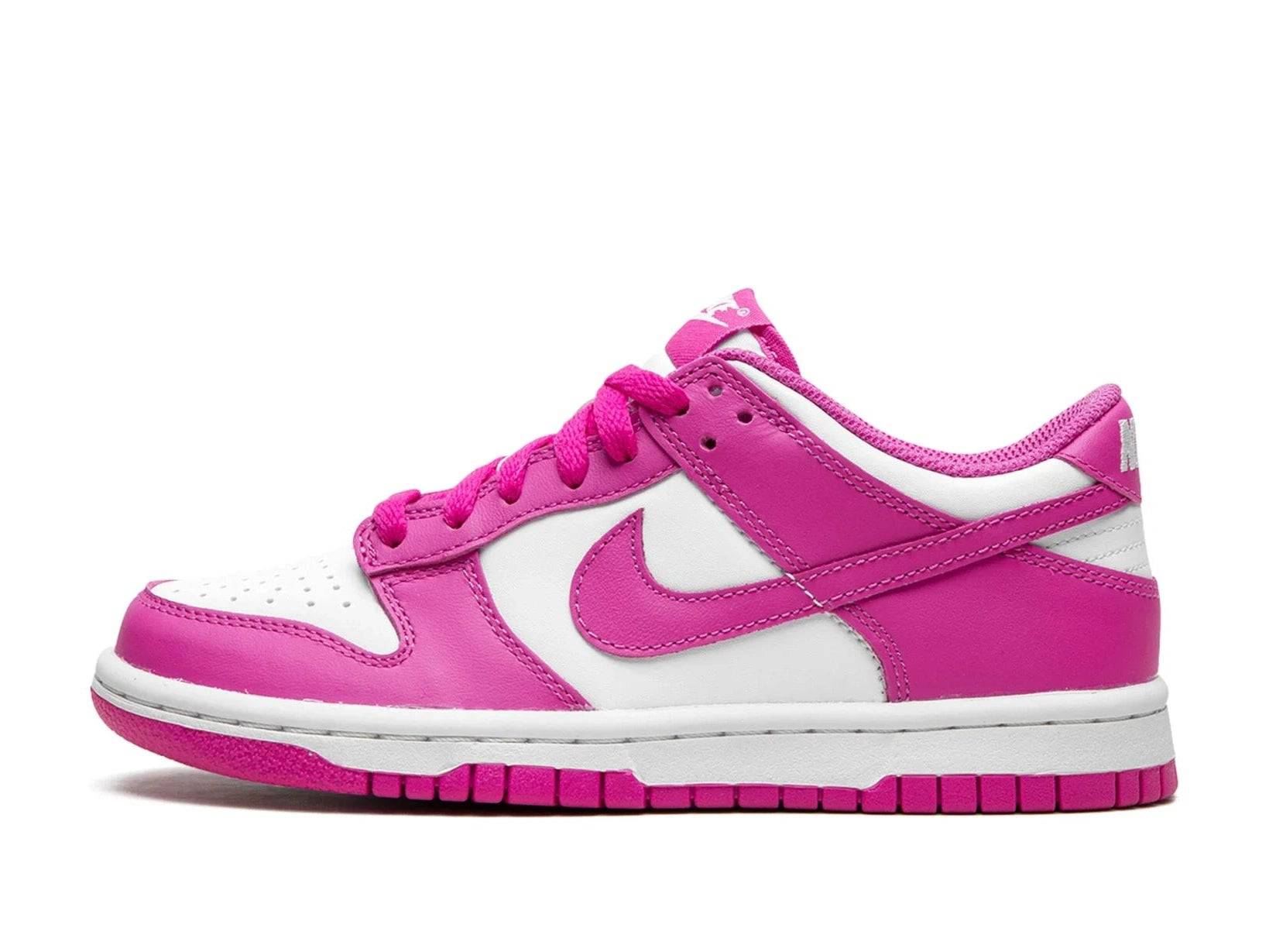 La Nike Dunk Low GS « Active Fuchsia » est la taille jeunesse de la chaussure de basket classique dans un coloris qui fait sans aucun doute tourner les têtes avec ses accents roses. Le « Active Fuchsia » donne au Dunk Low une ambiance à ne pas manquer avec la teinte rose vif des empiècements en cuir sur une base en cuir blanc. Le même rose fluo se retrouve également sur le Swoosh en cuir sur les côtés, sur l'étiquette de languette avec le branding « Nike », et sur les lacets. Il apparaît également sur la semelle extérieure en caoutchouc associée à la semelle intermédiaire blanche.
