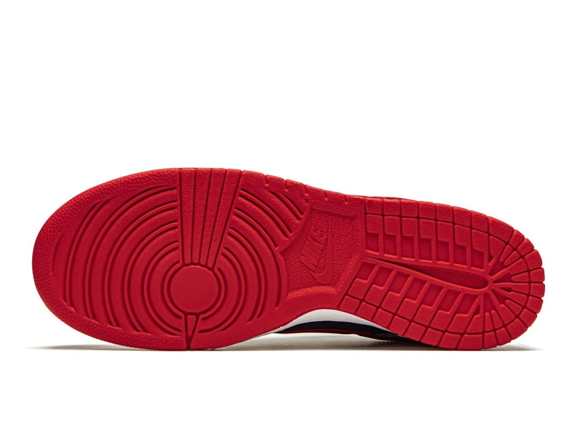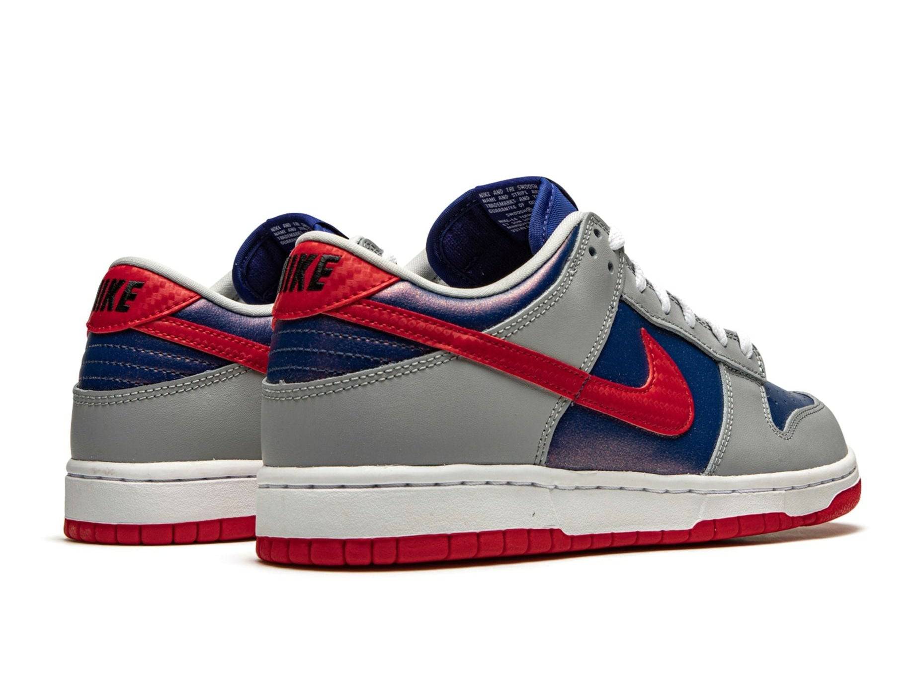 La Nike Dunk Low Retro « Samba » est la version remasterisée de l'ancien coloris uniquement japonais de 2001. Cette nouvelle version mondiale de la Dunk « Samba » en 2020 fait partie de la stratégie de Nike consistant à ramener les coloris Dunk autrefois rares de son initiative Co.Jp. La réédition moderne du « Samba » présente le même bloc de couleurs intéressant que le « OG », puisque du cuir bleu marine peut être trouvé sur le bout, le panneau central et le col en cuir perforé. Les empiècements en cuir argenté sur l'avant-pied, le col et le talon apportent un contraste saisissant à l'apparence de cette chaussure basse. Des touches Swoosh en cuir rouge Samba apparaissent de chaque côté et une broderie noire « Nike » se trouve au sommet de la languette de talon rouge. Les éléments de conception supplémentaires incluent des lacets en coton blanc, une languette en nylon bleu et des détails « Nike » blancs sur la languette en nylon bleu marine.