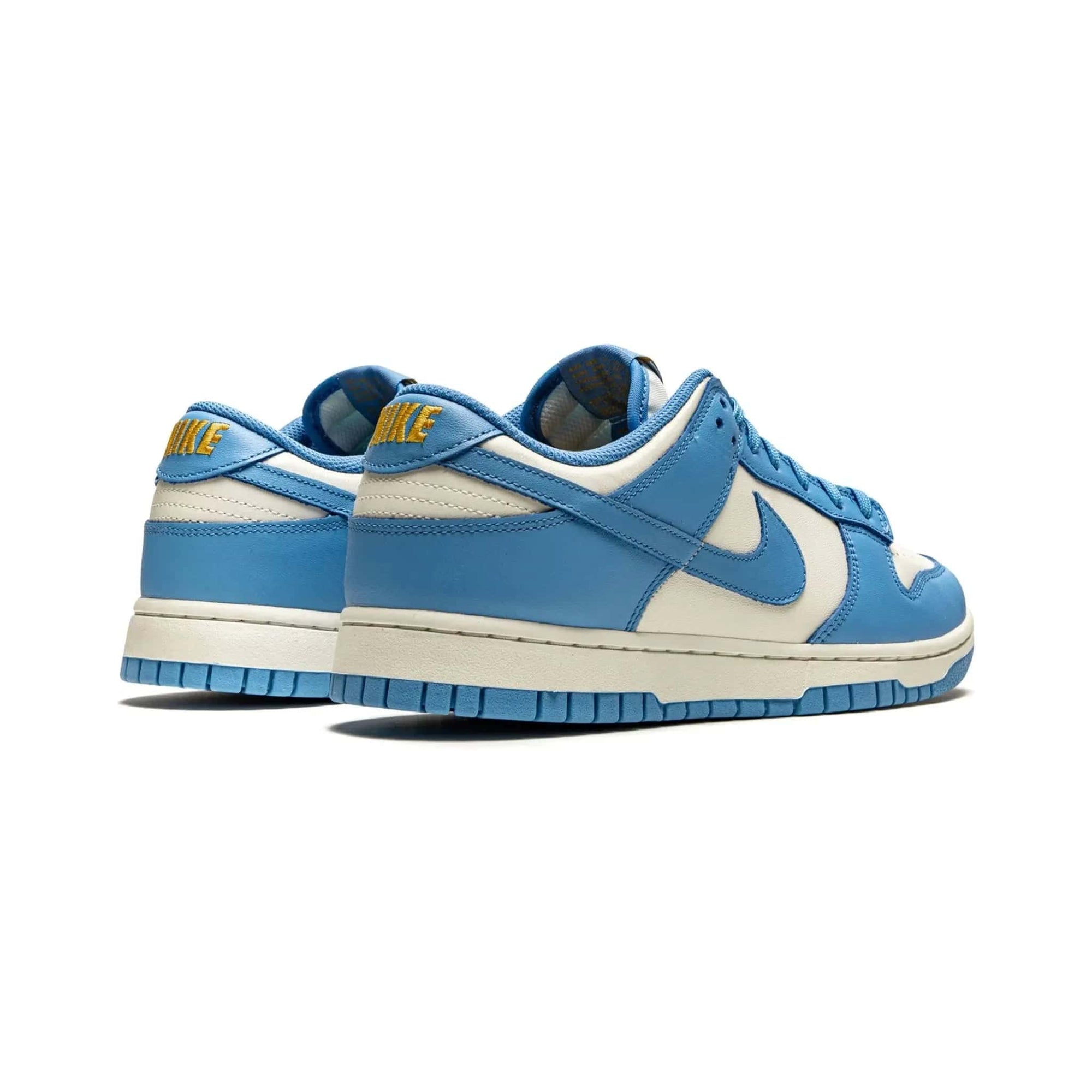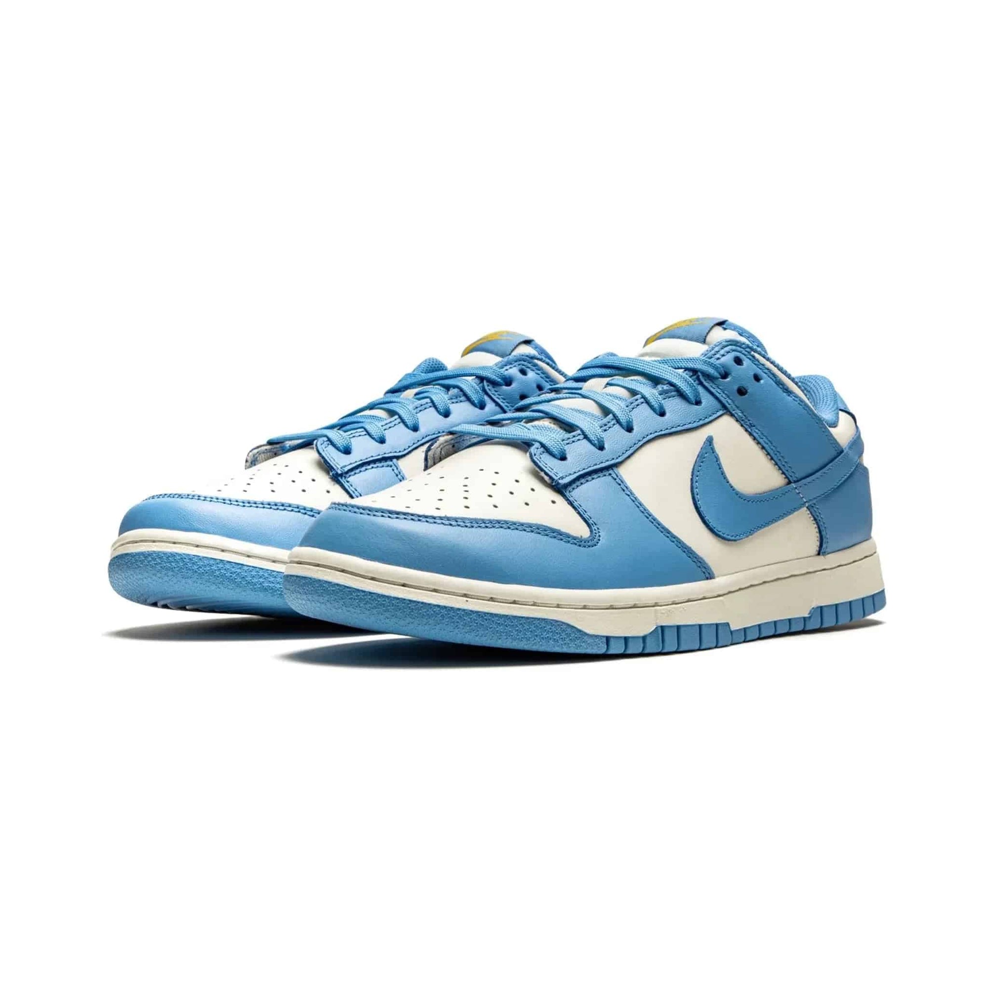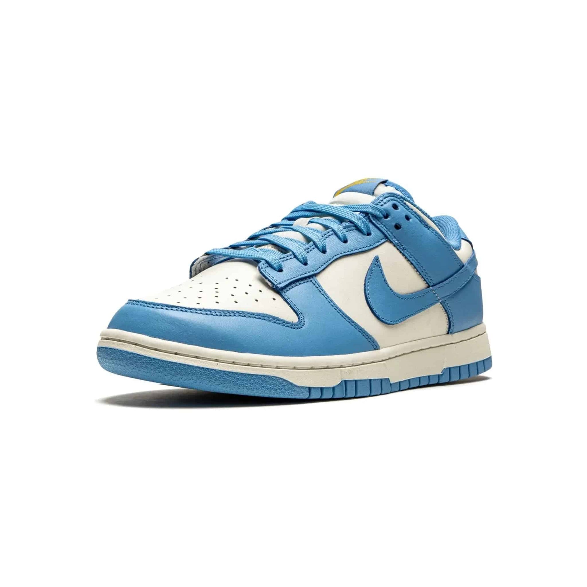 La Nike Dunk Low « Coast » pour femme est la taille femme de la silhouette basse durable lancée par Nike en janvier 2021. Apparemment inspirée par les Bruins de l'UCLA, le coloris « Coast » affiche fièrement la palette de couleurs bleu clair et or de l'établissement d'enseignement supérieur de Los Angeles dans son design. Des empiècements en cuir Coast (ou bleu clair) se trouvent sur l'avant-pied, les œillets, le col et le talon. La même teinte aérienne de bleu se trouve sur la marque Swoosh sur le panneau central, sur la languette du talon en cuir avec la broderie dorée « Nike », la doublure et les lacets des chaussures. L’accent University Gold se trouve sur l’étiquette de languette en nylon de marque « Nike Air ». Les touches finales incluent une languette en maille blanche, une semelle intercalaire en caoutchouc blanc et une semelle extérieure Coast.