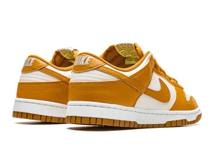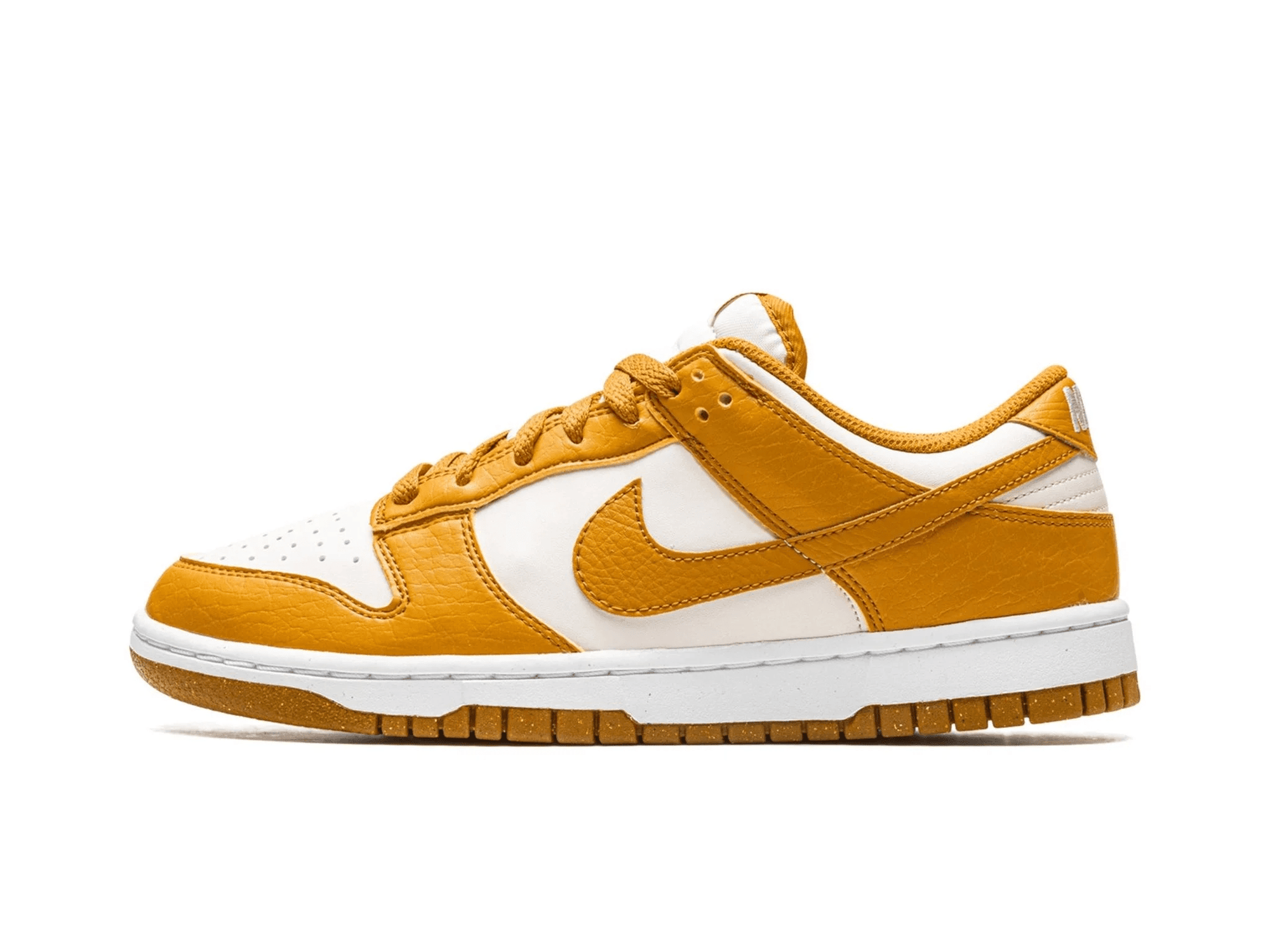 La Nike Dunk Low Next Nature « Phantom » pour femme est une édition exclusive pour femmes de la chaussure lifestyle fabriquée avec des matériaux durables. La Dunk Low Next Nature dans le coloris « Gold/Phantom » présente une base en cuir blanc avec des empiècements en cuir Gold contrastés et la marque Swoosh. Les détails « Nike » sont brodés en lettres blanches sur le talon et l'insigne classique « Nike » se trouve sur la languette. Sous le pied, Nike associe la semelle intercalaire en caoutchouc blanc à une semelle extérieure dorée fabriquée avec son matériau Nike Grind recyclé pour compléter le look.