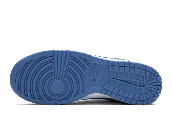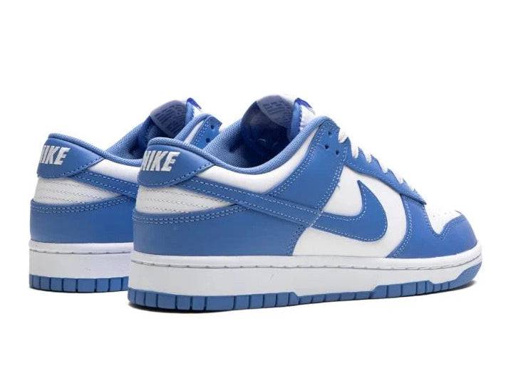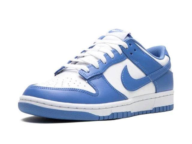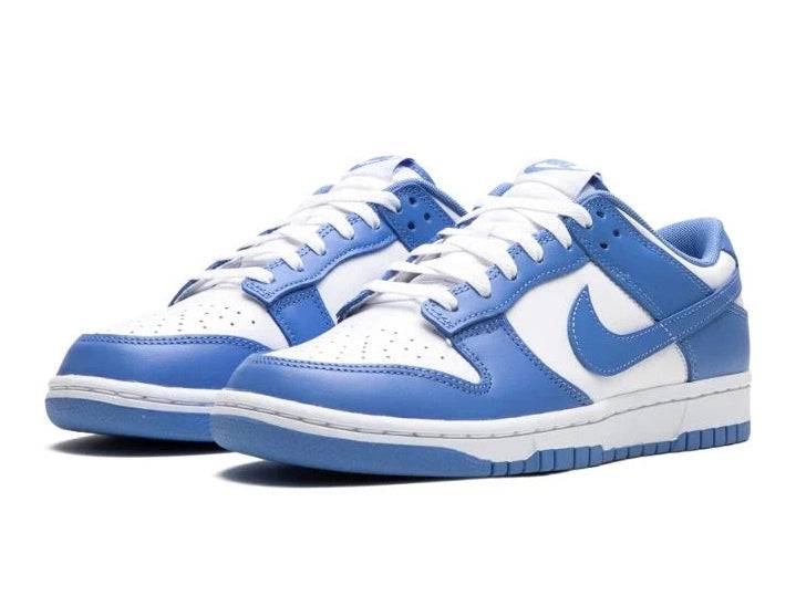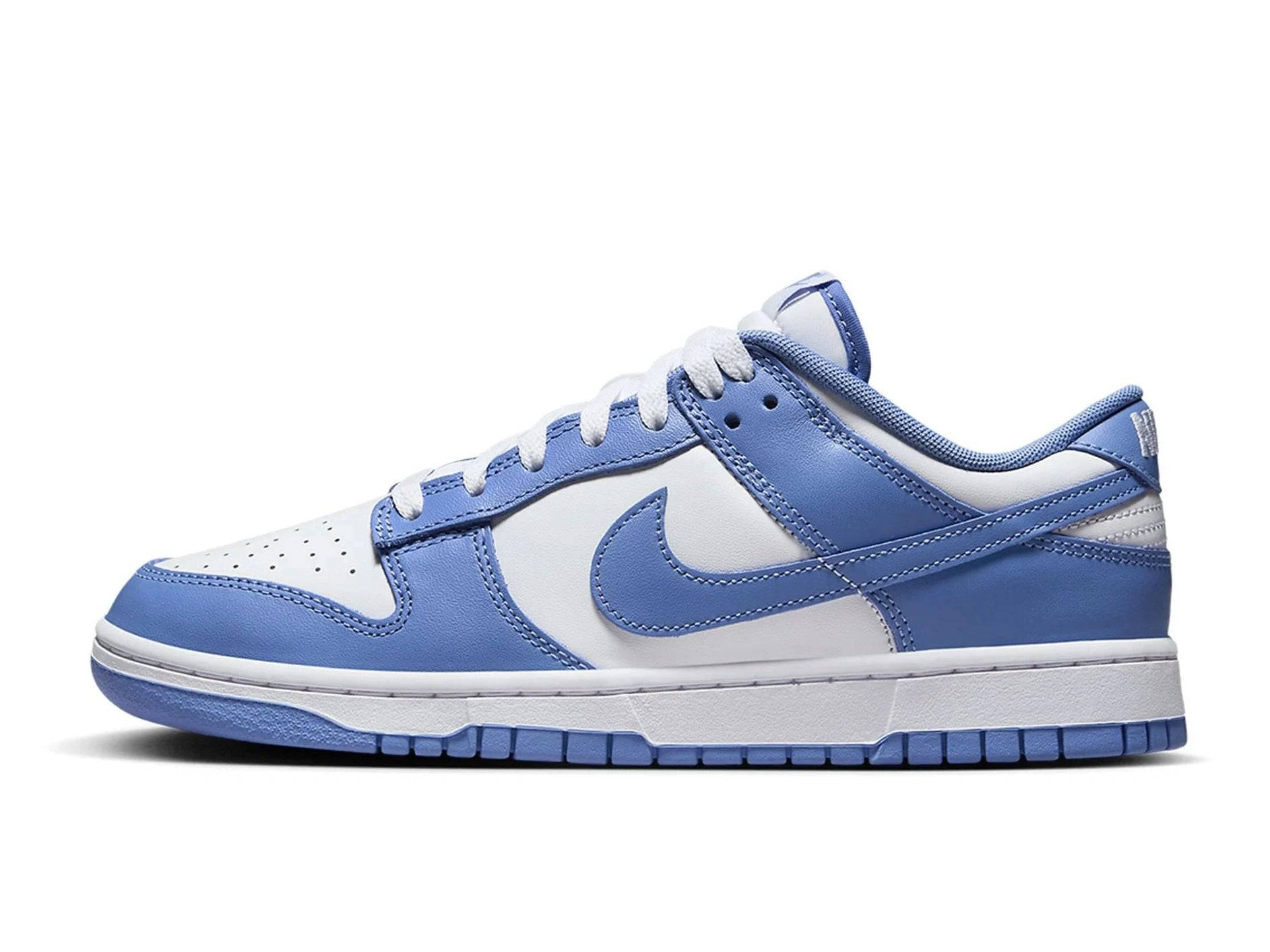 La Nike Dunk Low "Polar Blue" est un coloris de la sneaker de basket-ball rétro avec un bloc de couleur bicolore épuré mis en valeur par du bleu clair. Rappelant le coloris classique « UNC », cette Dunk a une base en cuir blanc et des empiècements en cuir Polar Blue. Un Swoosh en cuir bleu polaire apparaît sur le panneau central. La marque « Nike » est brodée sur le talon et imprimée sur la languette. Une semelle intercalaire blanche et une semelle extérieure bleue complètent le look.