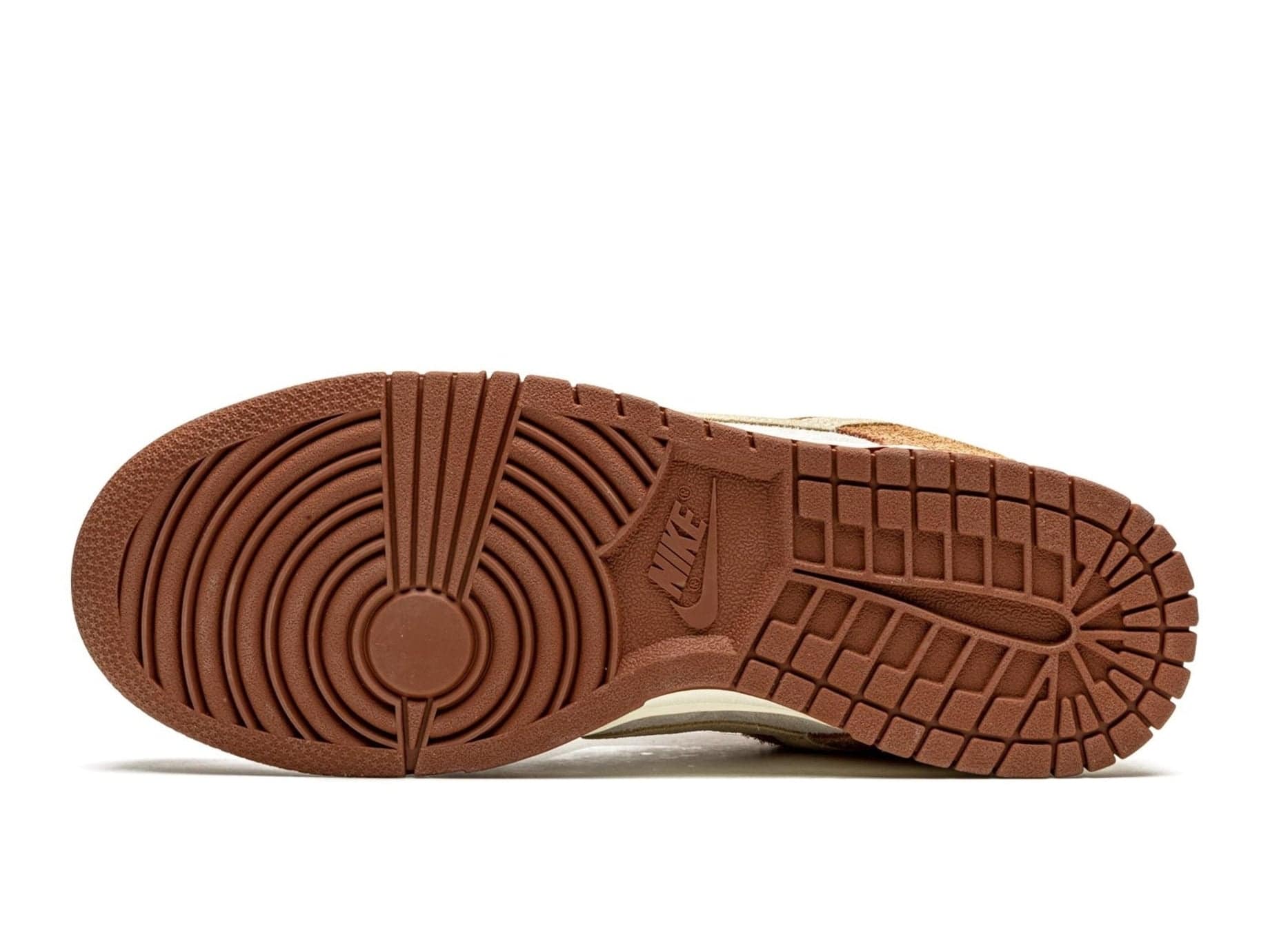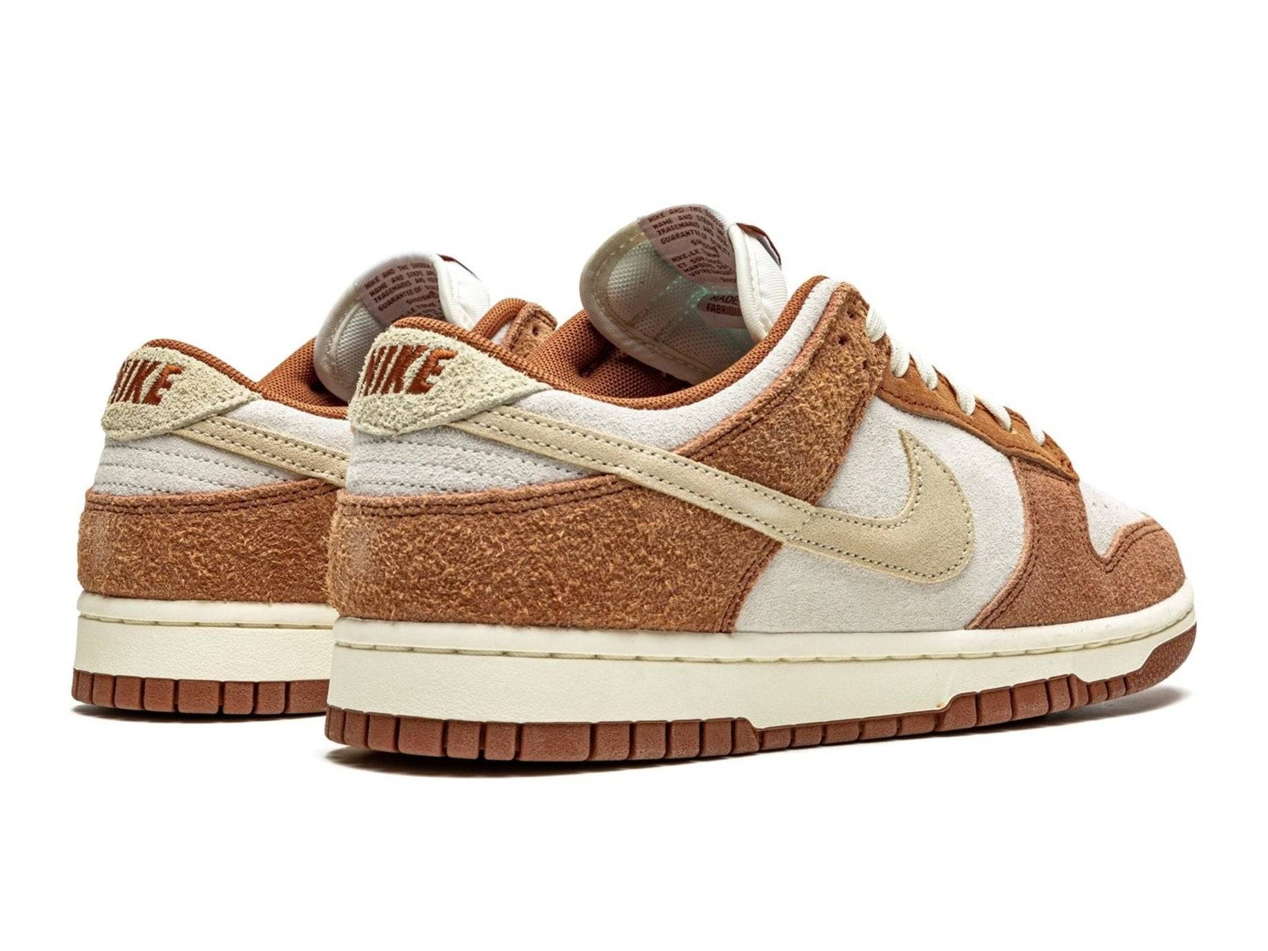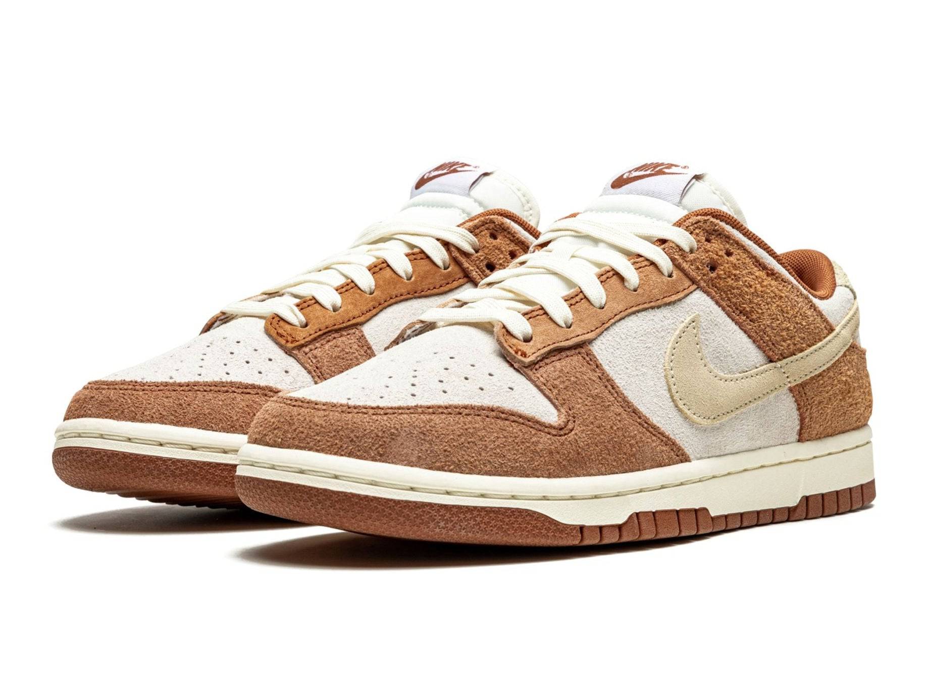 La Nike Dunk Low PRM « Medium Curry » a habillé l'ancienne chaussure de basket-ball de performance et la chaussure de style de vie actuelle dans un coloris automnal. L’un des nombreux atouts du Dunk est sa capacité à combiner différentes couleurs et textures de manière attrayante, et le « Medium Curry » ne fait pas exception à ce sentiment. Des empiècements en daim marron poilu sur l'avant-pied, les œillets, le col et le talon se détachent sur la base en cuir blanc. Une nuance de crème appelée « Fossil » est appliquée sur le Swoosh en daim et la languette du talon avec une broderie « Nike » marron. La marque « Nike » marron réside sur l'étiquette de la languette et une semelle intercalaire blanche et une semelle extérieure marron apportent la touche finale à une autre Nike Dunk ultra fraîche.