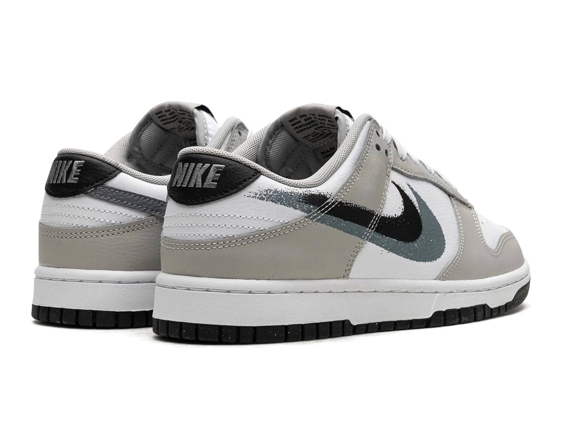 La Nike Dunk Low « Stencil Swoosh » est un coloris de la chaussure de basket-ball rétro avec des Swooshes superposés. Le Dunk Low « Stencil Swoosh » présente une base en cuir blanc qui contraste avec des empiècements en cuir Cool Grey et des Swooshes de style peint à la bombe en noir et gris sur le côté. La marque classique « Nike » est visible sur le talon et à côté d’un Swoosh sur l’étiquette de la languette. Sous le pied, la semelle intercalaire en caoutchouc blanc et la semelle extérieure en caoutchouc noir complètent le look.