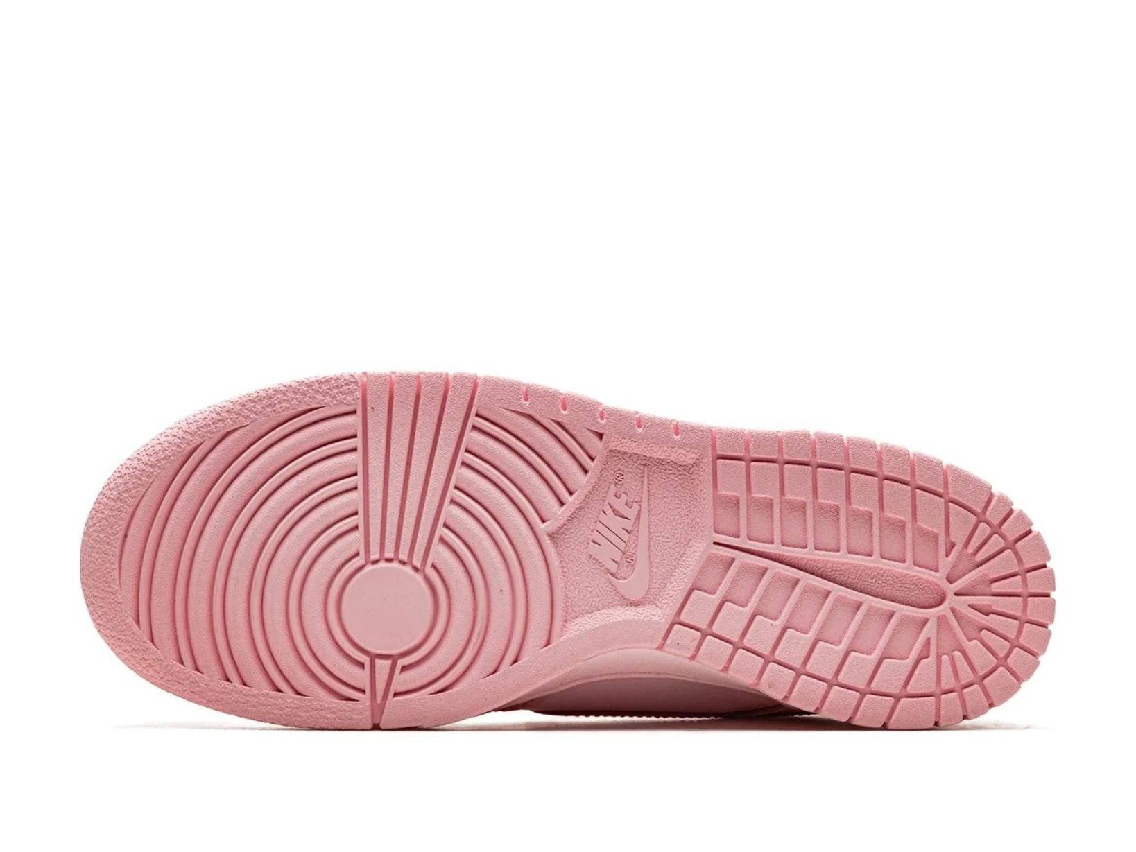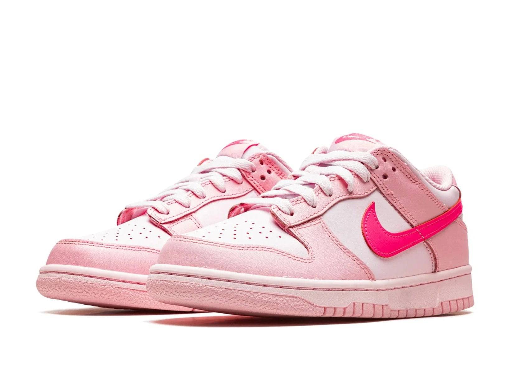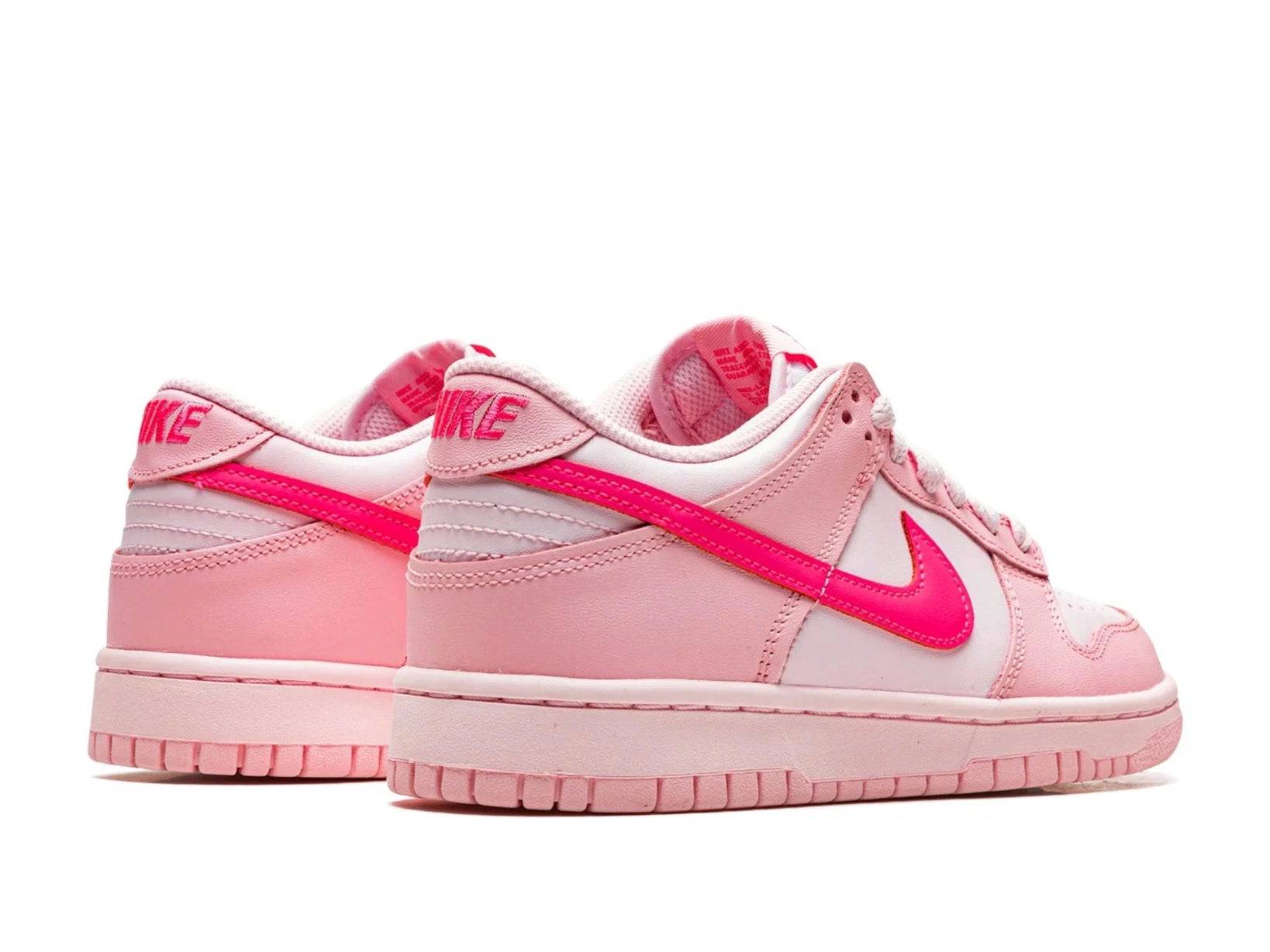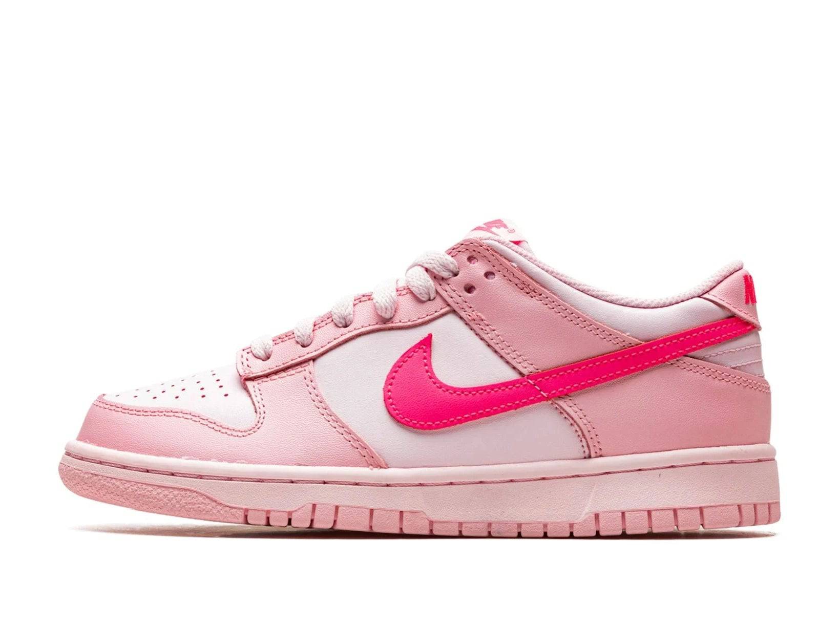 La Nike Dunk Low GS « Triple Pink » est la taille jeunesse de la chaussure de basket vintage dans un coloris comportant différentes nuances de rose. Le «Triple Pink» présente du cuir rose clair sur la pointe perforée, le panneau central, le col et le talon. Les superpositions sont conçues dans une teinte moyenne de cuir rose. Un Swoosh en cuir rose fluo se retrouve de part et d'autre de la chaussure. La même nuance de rose apparaît sur la marque « Nike » brodée sur le talon et les détails « Nike » et Swoosh sur l’étiquette de la languette. L'apparence entièrement rose de la chaussure se poursuit sur la semelle intermédiaire et la semelle extérieure.