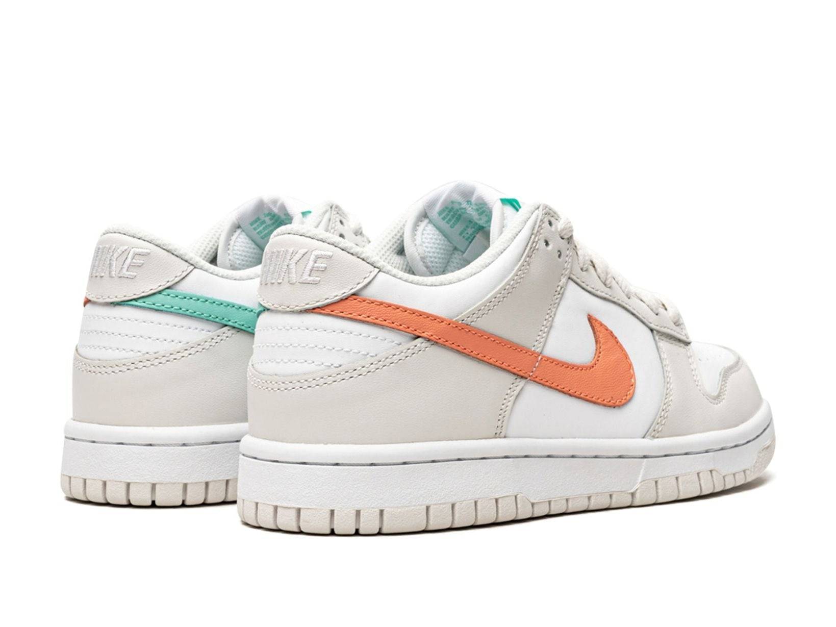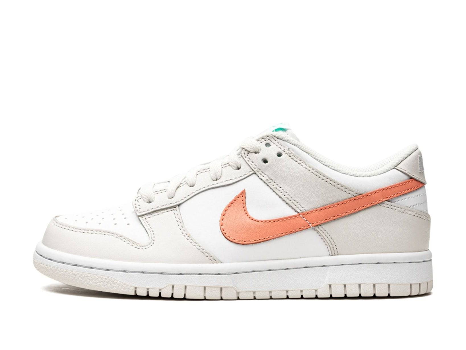 La Nike Dunk Low GS « Mismatch Swoosh - Tropical Twist » est une édition pour enfants de l'emblématique chaussure lifestyle basse de Nike avec deux Swooshes en cuir de couleurs différentes sur son design. Apparaissant dans un bloc de couleur blanc et gris similaire à celui du style « Vast Grey » de Dunk, le « Mismatch Swoosh - Tropical Twist » affiche du cuir blanc sur la pointe perforée, le panneau central, le col et le talon. Un faible contraste de cuir gris sur l'avant-pied, les œillets, le col et le talon équilibre le look. Des Swooshes en cuir orange et bleu sarcelle dépareillés apparaissent respectivement sur les côtés latéraux et médiaux de chaque chaussure. Les détails sarcelle « Nike » et Swoosh sont imprimés sur l’étiquette de languette en nylon blanc sur la languette en nylon blanc et la marque grise « Nike » est brodée sur le talon. Le coloris inspiré de l'été est complété par une semelle intercalaire en caoutchouc blanc et une semelle extérieure grise.