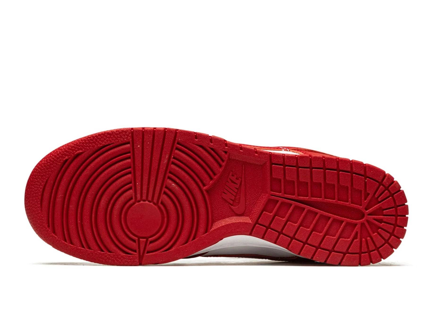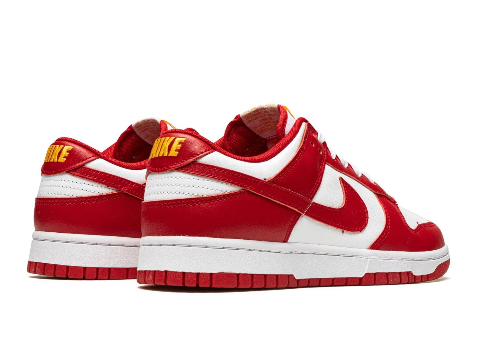 La Nike Dunk Low « USC » est un coloris de la chaussure de basket-ball rétro qui rend hommage officieusement à l'équipe de basket-ball universitaire des USC Trojans. Basé sur les couleurs de l'uniforme de l'équipe des Trojans, le « USC » présente une base en cuir blanc avec des empiècements en cuir contrastés de couleur rouge Gym et la marque Swoosh. Des détails « Nike » dorés sont brodés sur le talon. Des accents dorés supplémentaires peuvent être trouvés sur les logos « Nike » et Swoosh sur l’étiquette de langue en nylon blanc. Une semelle intercalaire en caoutchouc blanc et une semelle extérieure Gym Red complètent le look. Le « USC » est l'un des nombreux Dunks classiques conçus dans l'esprit des équipes de basket-ball universitaires populaires.