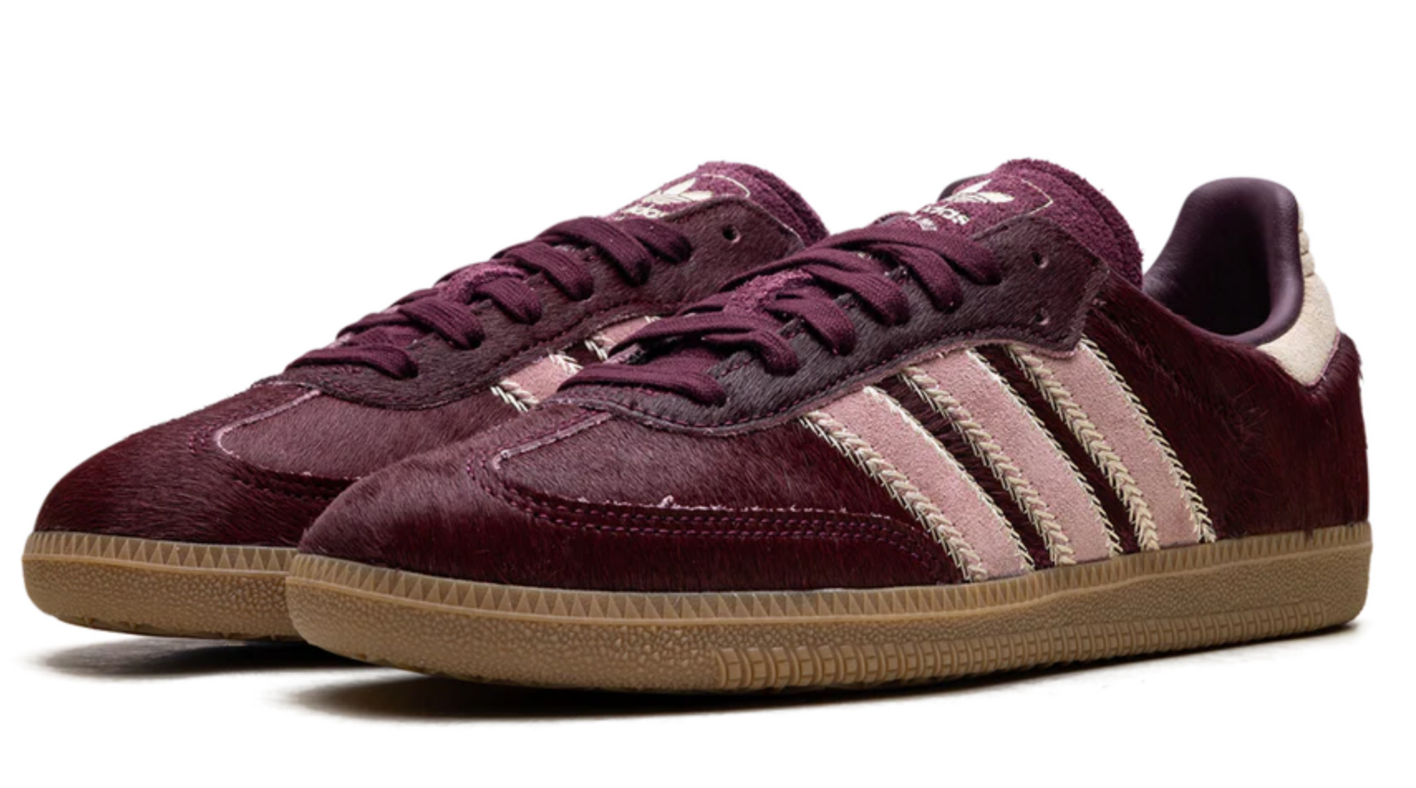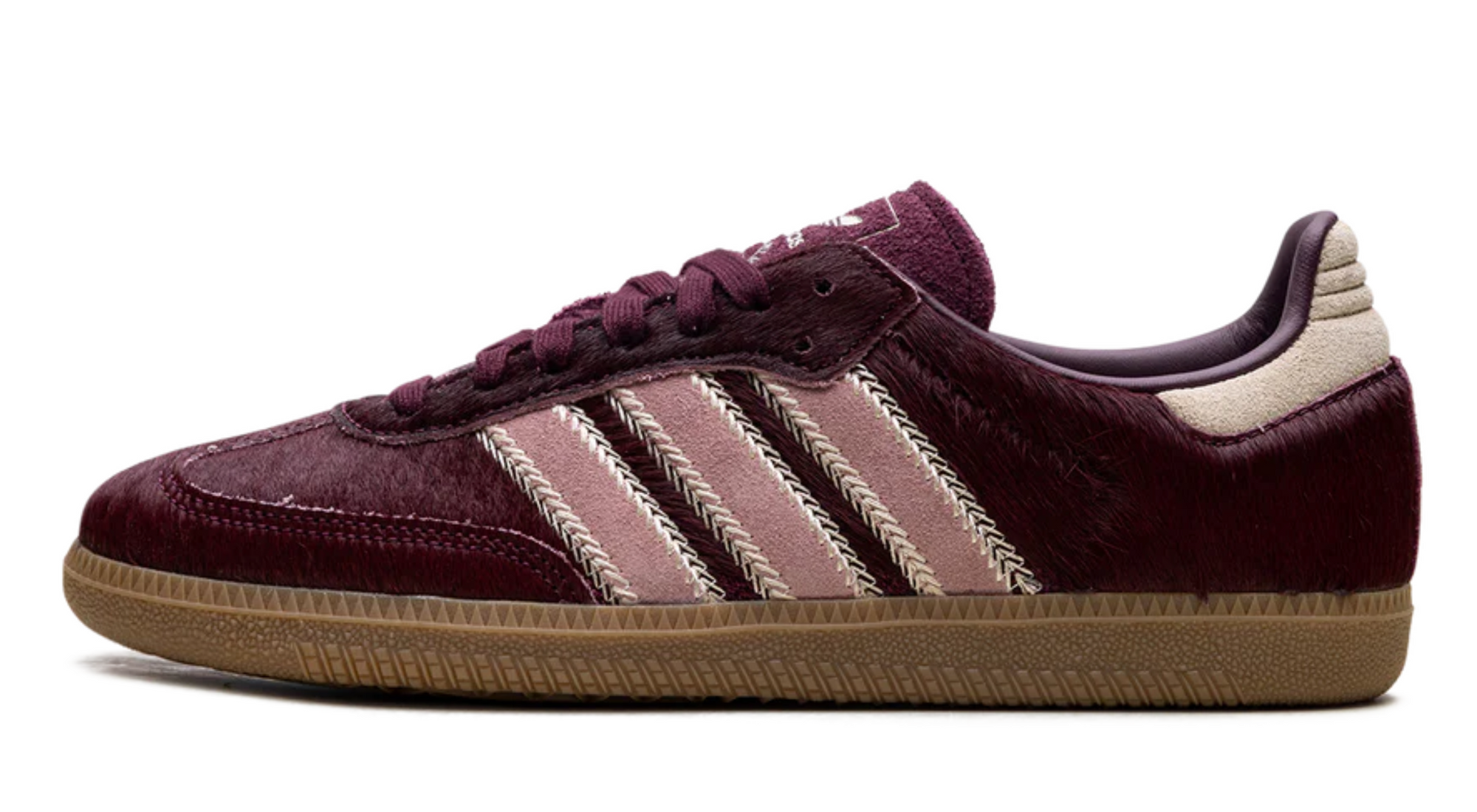 De Samba OG WMNS Maroon Sand Strata Pony tilt een klassieker naar een hoger modelevel. Deze opvallende uitvoering van de geliefde Samba OG combineert traditioneel sportdesign met luxueuze, eigenwijze materialen. Het bovenwerk is bekleed met diep bordeauxrode pony hair, dat niet alleen de aandacht trekt maar ook textuur en karakter toevoegt. De zandkleurige suède Three Stripes met visgraatstiksel maken de mix van materialen helemaal af.